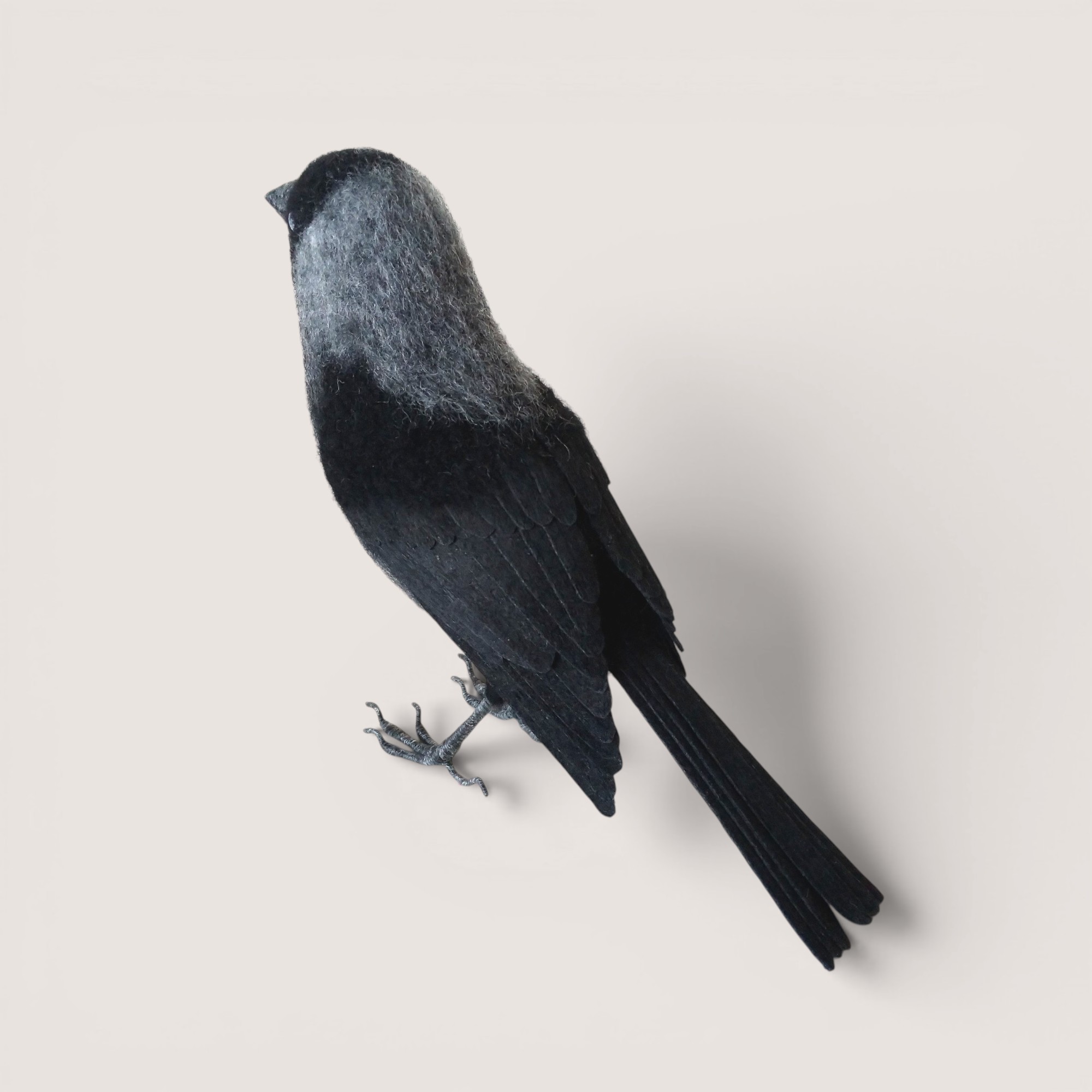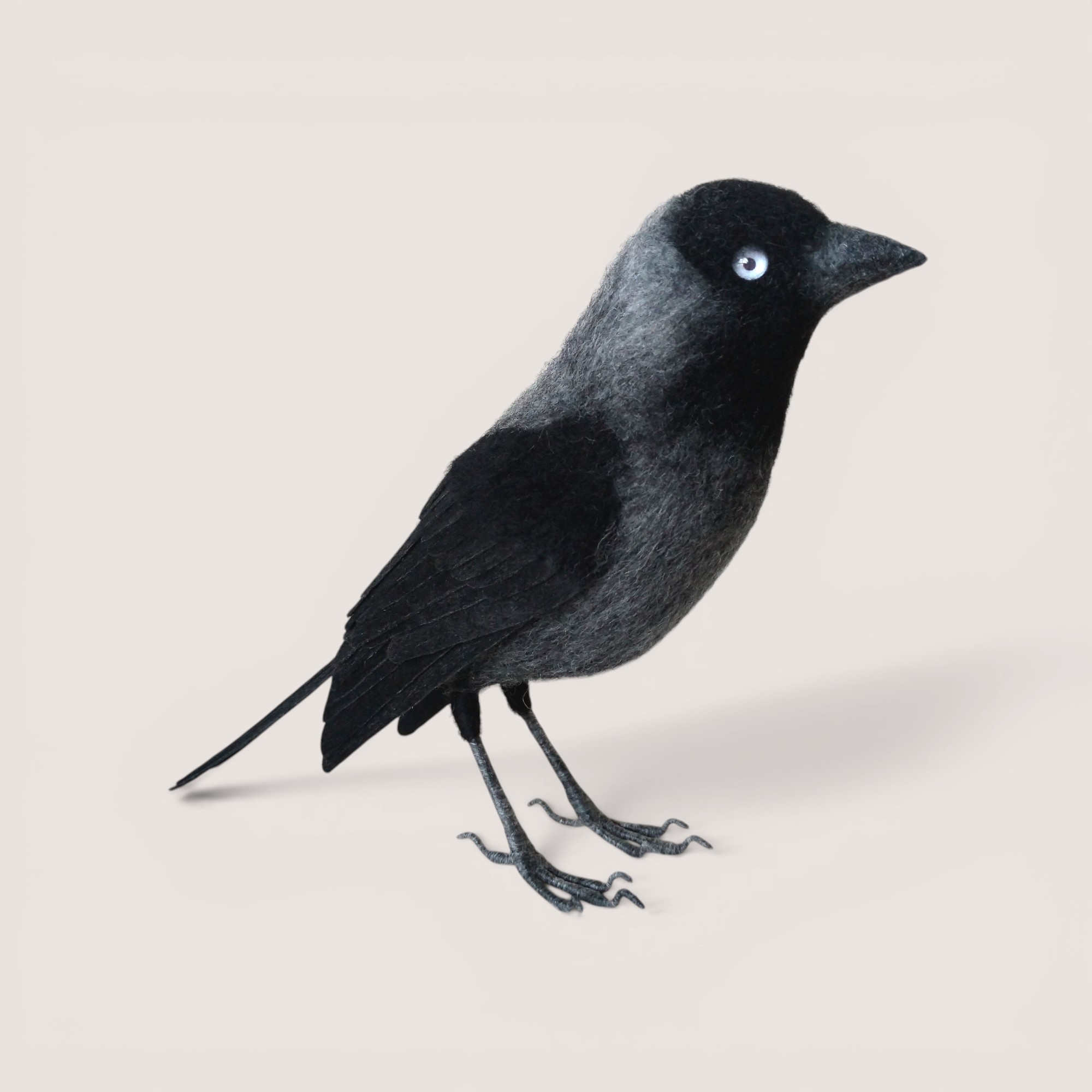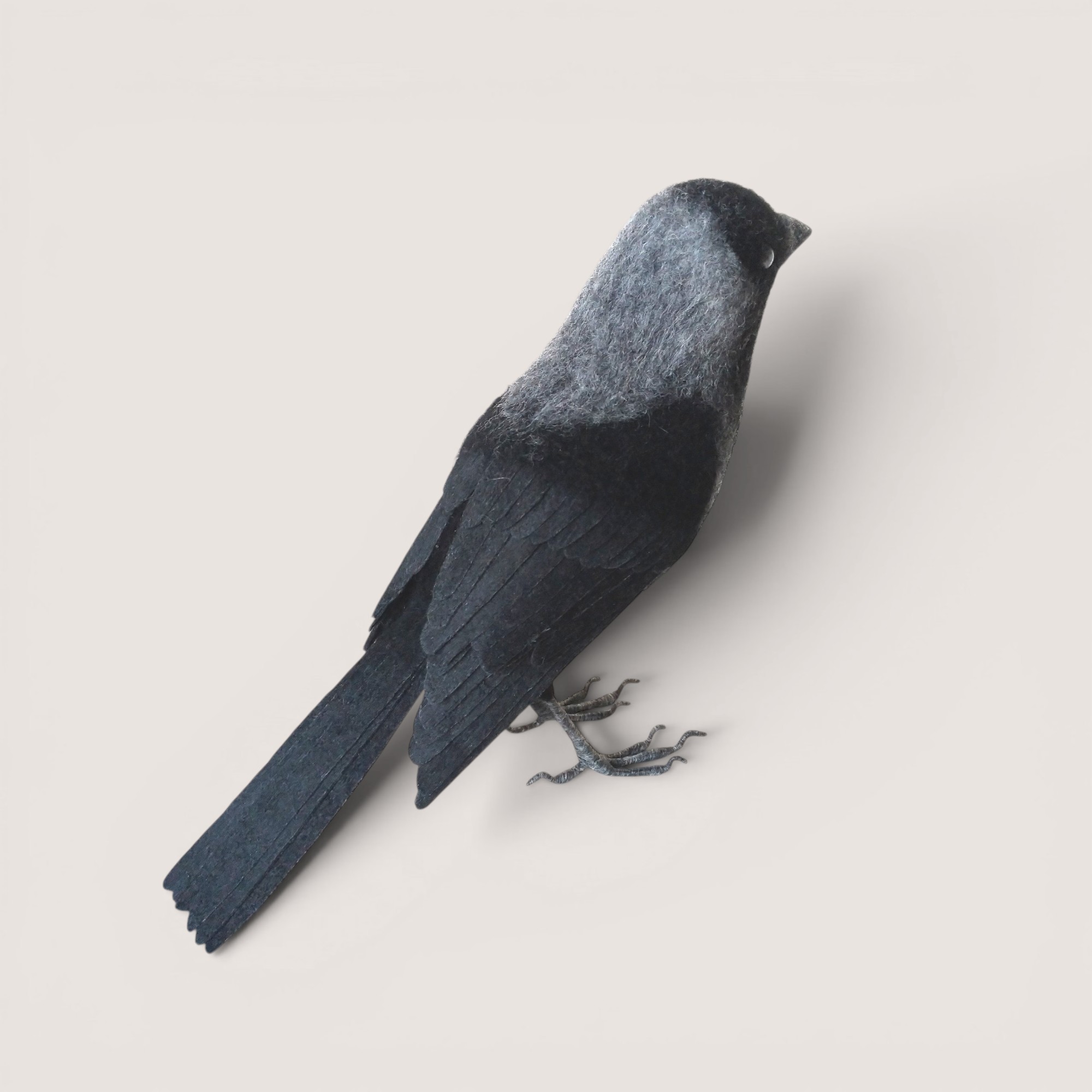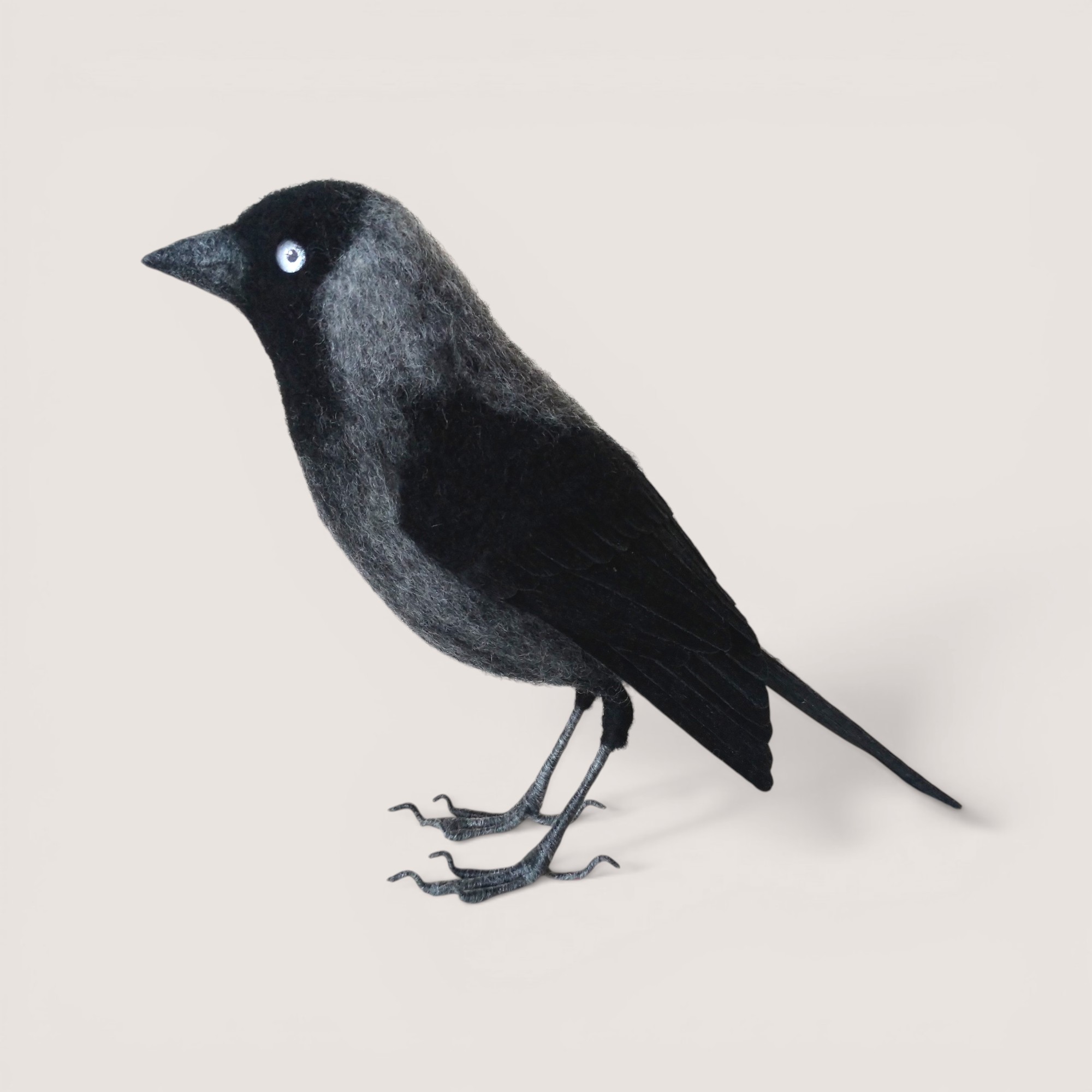 A hand-sculpted jackdaw inspired by the sleek silhouette and distinctive pale eye of this intelligent member of the crow family. Shaped in wool and carefully layered to create natural feather texture, the piece captures the subtle tonal variation between the darker body and softer grey nape.