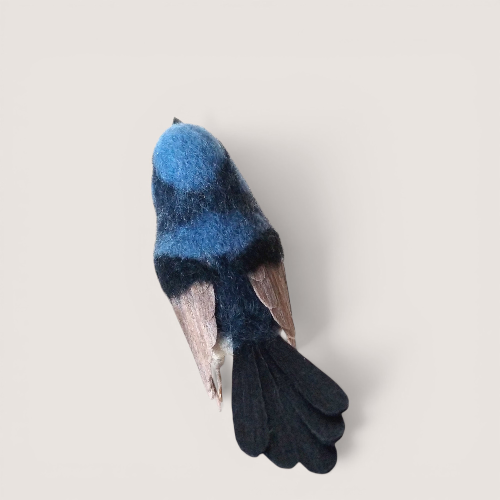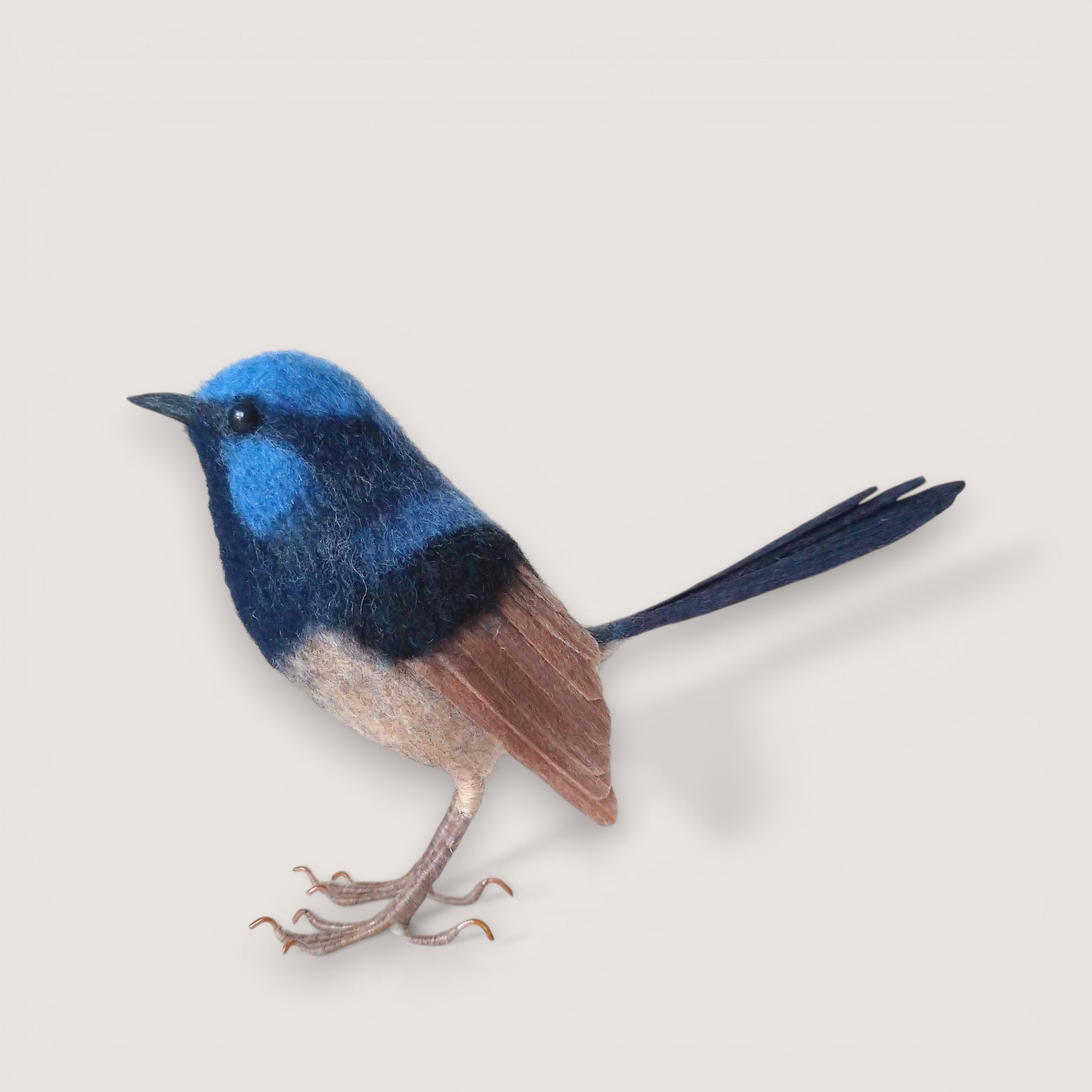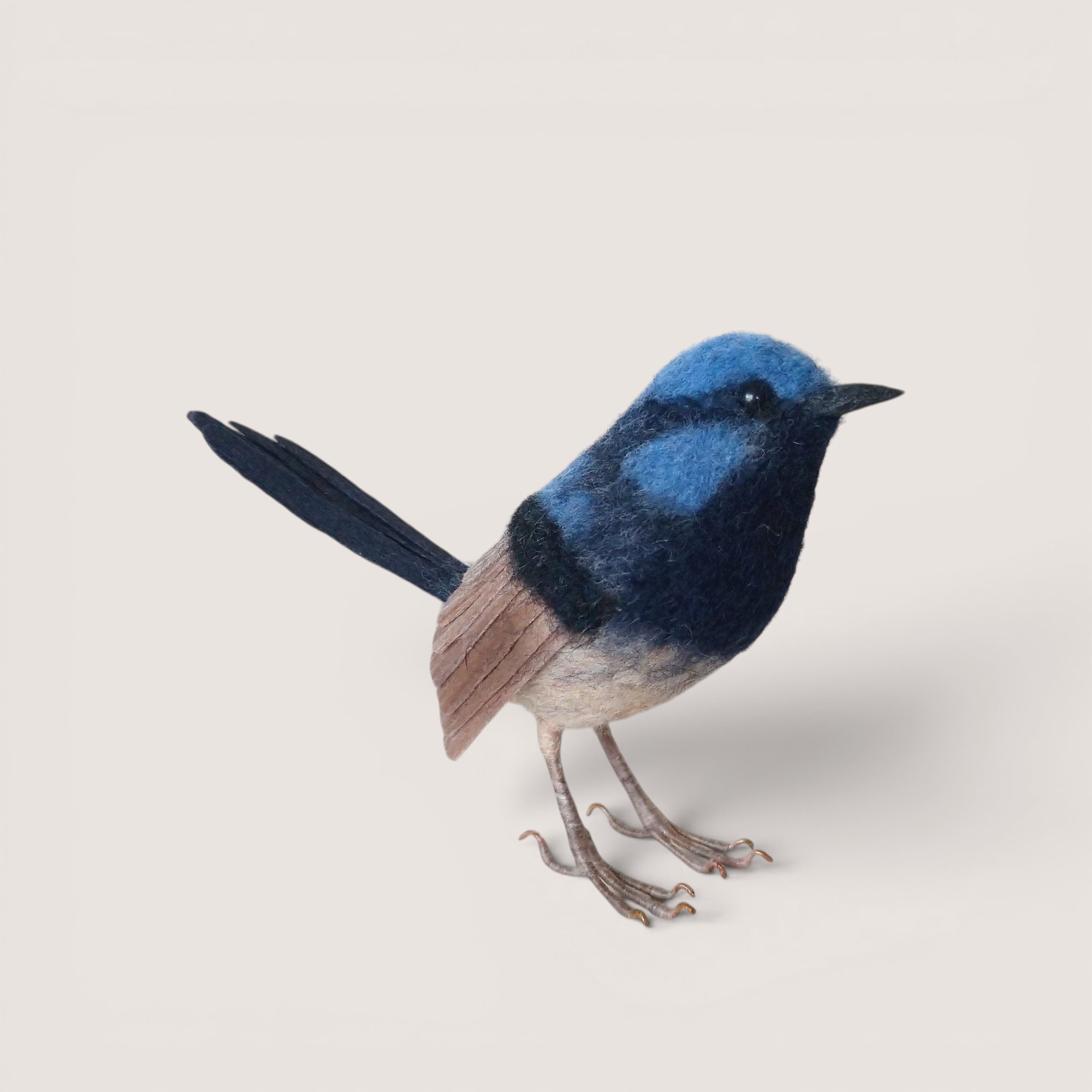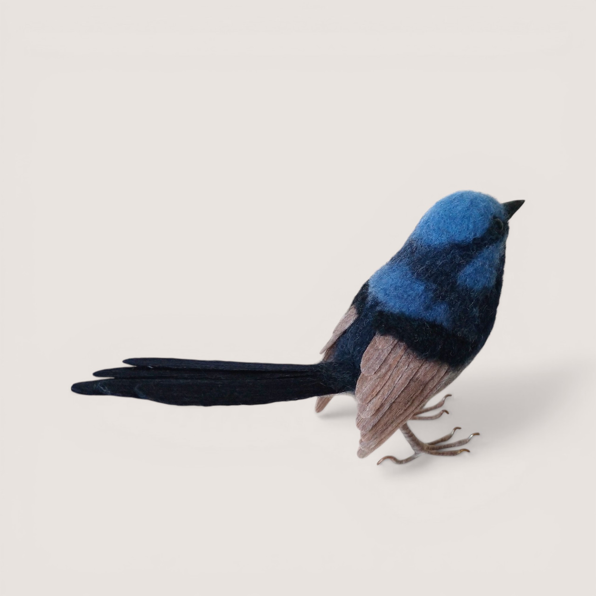 A hand-sculpted superb fairy wren inspired by the vivid blue and black plumage of this distinctive Australian songbird. Shaped in wool and carefully layered to create natural feather texture, the piece captures the compact form and elegantly elongated tail characteristic of the species.