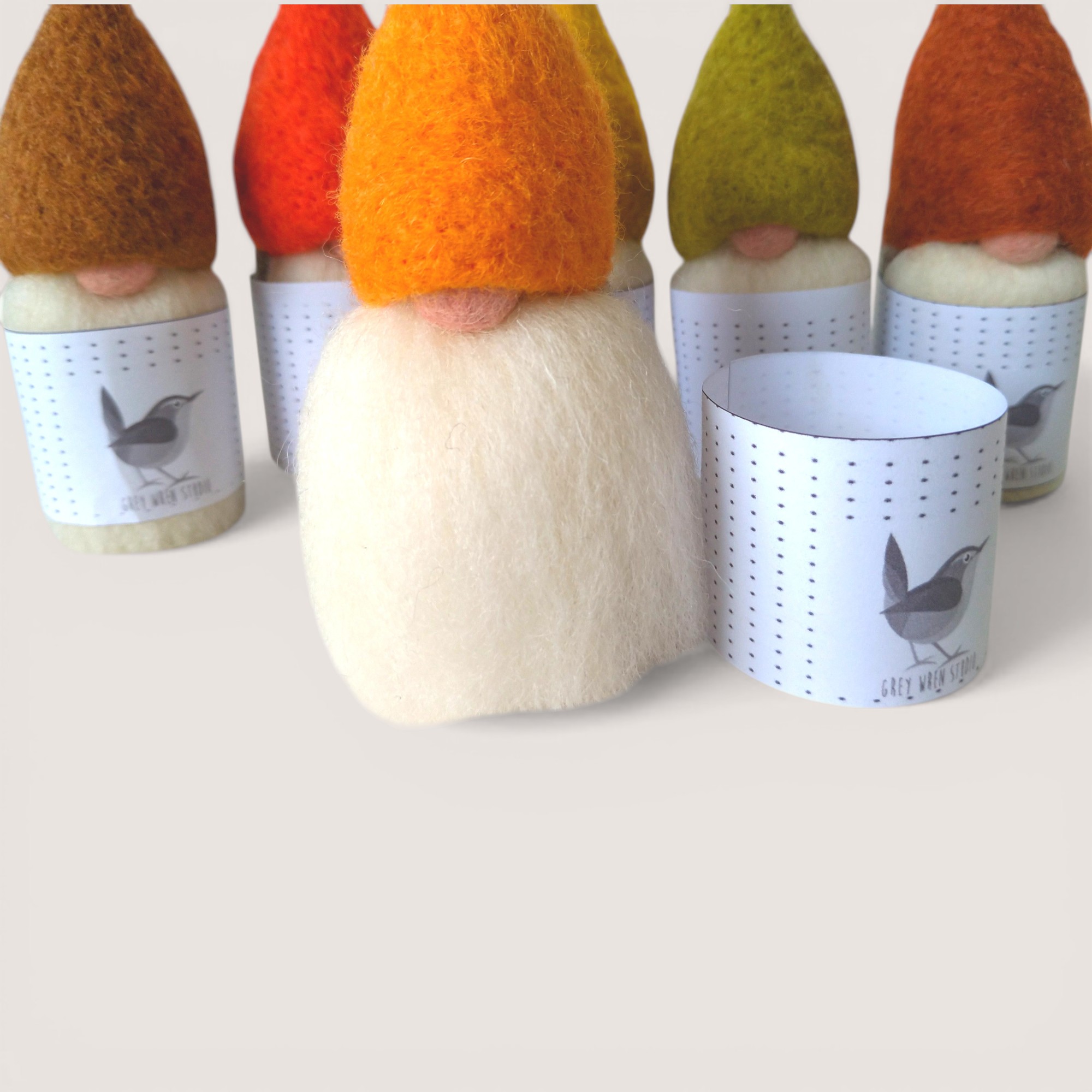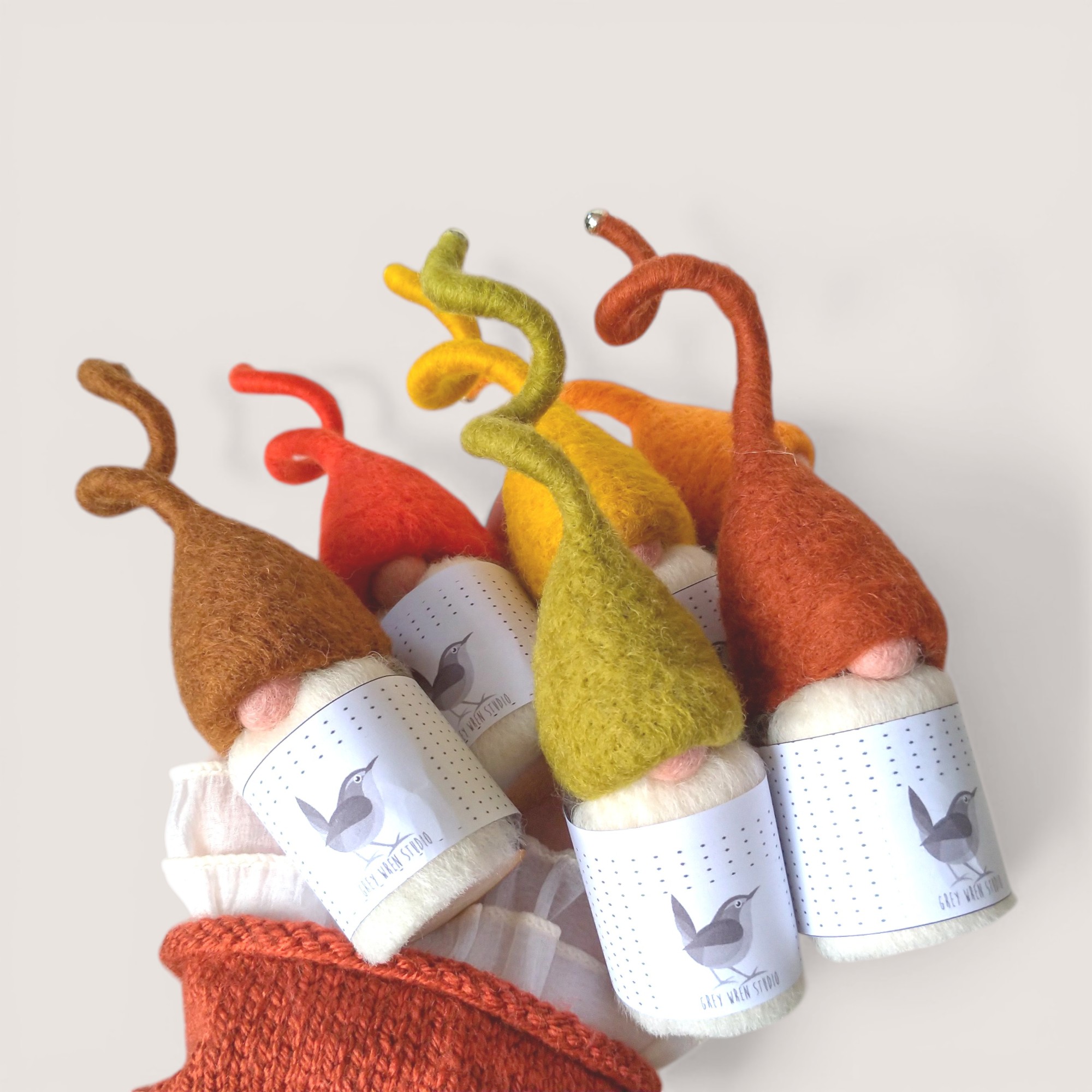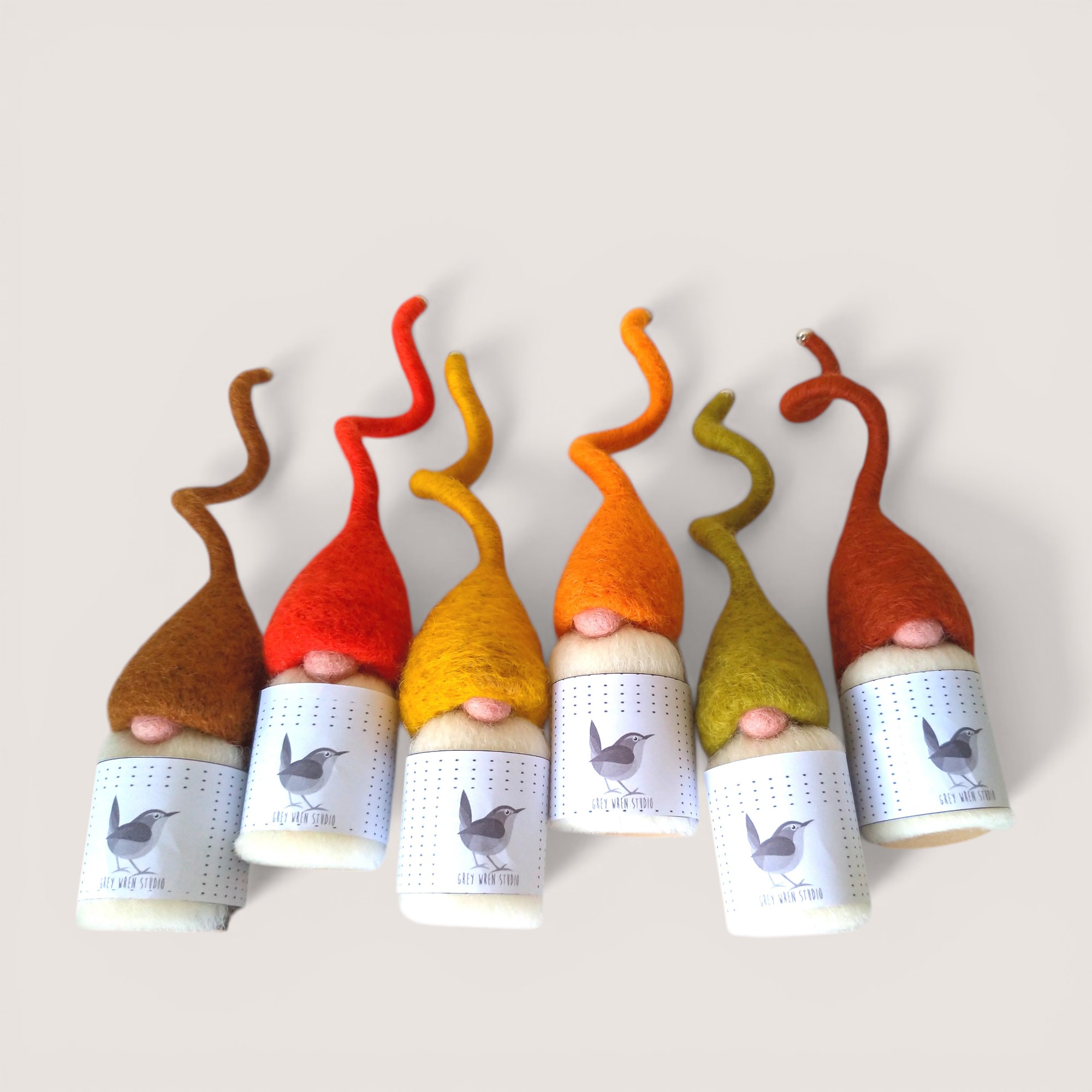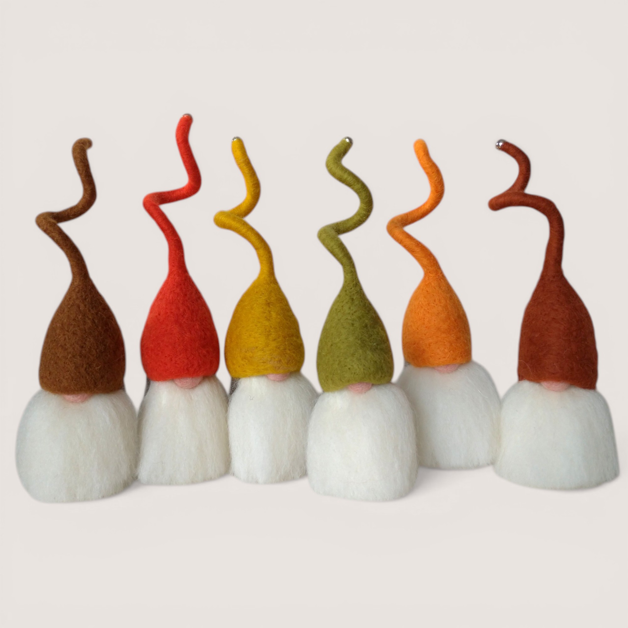 A curated set of six handmade Tomten in warm autumn tones — Cinnamon, Tomato Red, Mustard, Lichen Green, Marigold, and Russet. Sculpted in wool with a mid-grey body and individual character, this set brings together a seasonal palette inspired by hedgerows, turning leaves, berries, and the richness of autumn colour.